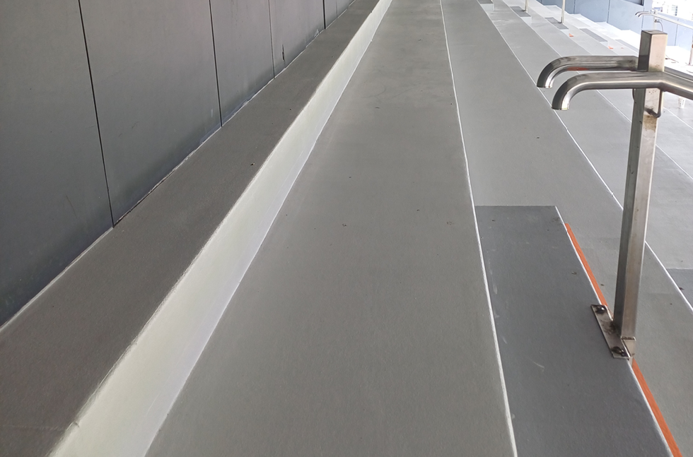 Epoxy Flooring Ltd completed the two-month project with meticulous preparation. First, the existing failed coating was removed by diamond grinding the surface to a Concrete Surface Profile (CSP) of 3. This created the ideal surface for the new system to bond to. Damaged fibre-cement boards were replaced, and all boards were re-secured with additional mechanical fixings to guarantee substrate stability.