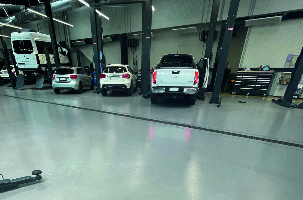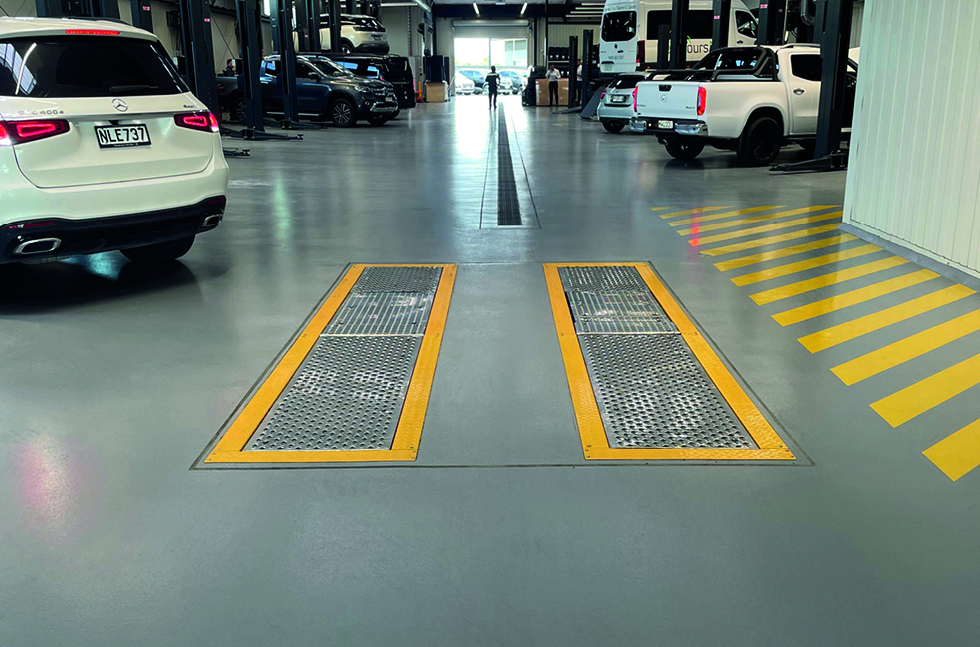 Mercedes Benz required a floor finish that would stand up to the daily traffic of vehicles coming in and out of their busy maintenance service area and combine functionality with aesthetics.