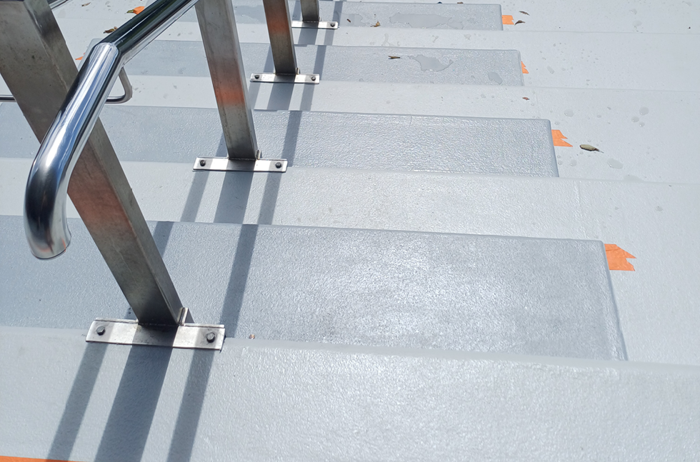 Epoxy Flooring Ltd completed the two-month project with meticulous preparation. First, the existing failed coating was removed by diamond grinding the surface to a Concrete Surface Profile (CSP) of 3. This created the ideal surface for the new system to bond to. Damaged fibre-cement boards were replaced, and all boards were re-secured with additional mechanical fixings to guarantee substrate stability.