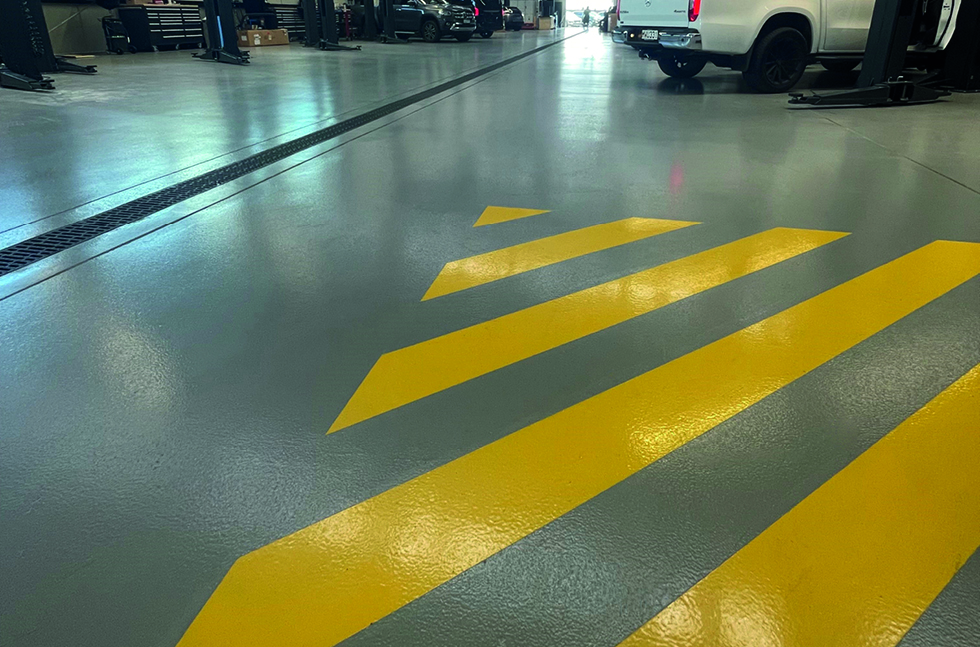 Mercedes Benz required a floor finish that would stand up to the daily traffic of vehicles coming in and out of their busy maintenance service area and combine functionality with aesthetics.